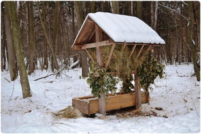 В угодьях наиболее экономично изготавливать кормушки-ясли легкого типа с лотками для сена, концентрированных кормов и корнеплодов. Рекомендуется изготовление 1 кормушки на 3-5 особей.