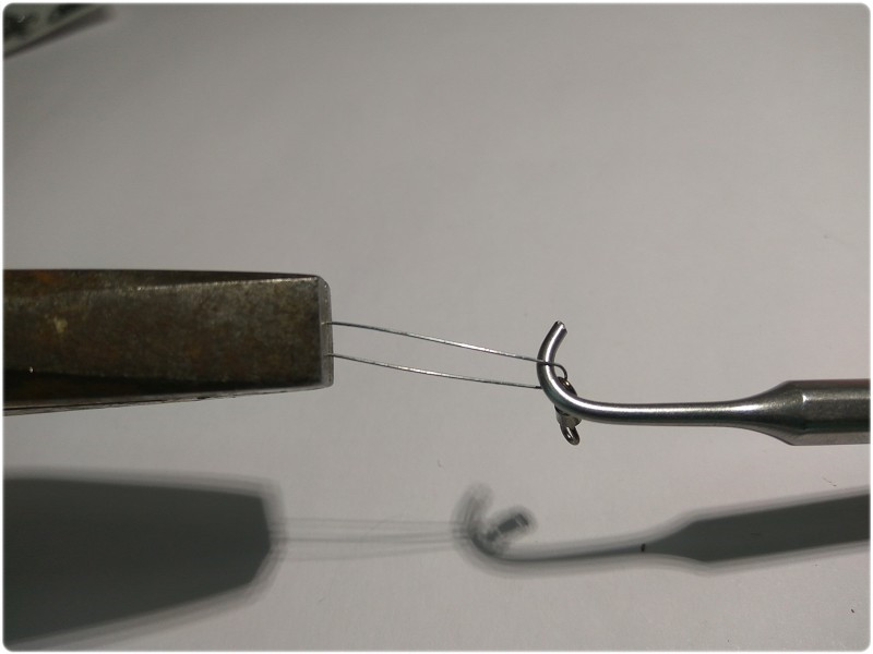 - На поводок со стороны шнура необходимо ставить либо вертлюг, либо зажимное кольцо, либо карабин, так как проволока довольно тонкая, узел на шнуре пережигает сам себя.