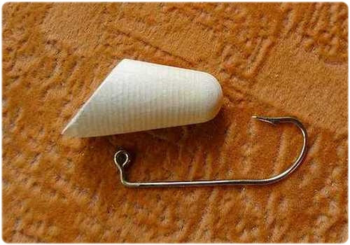 Обмазав «Суперклеем» (лучше эпоксидным клеем) цевье крючка, вклеиваем его в корпус будущего воблера, вставив в прорезь.